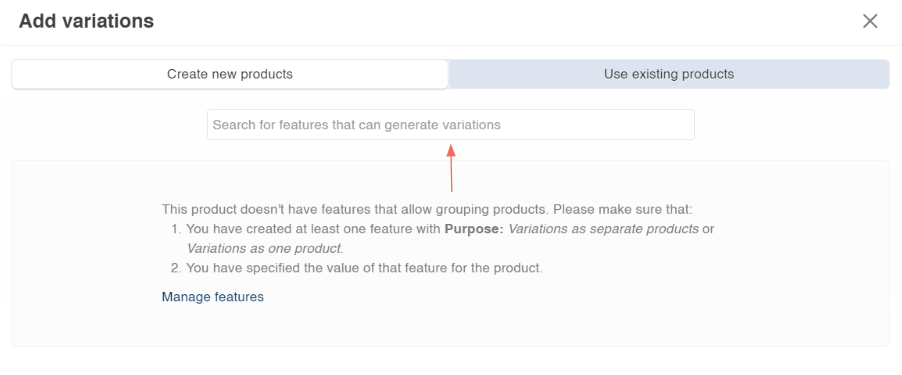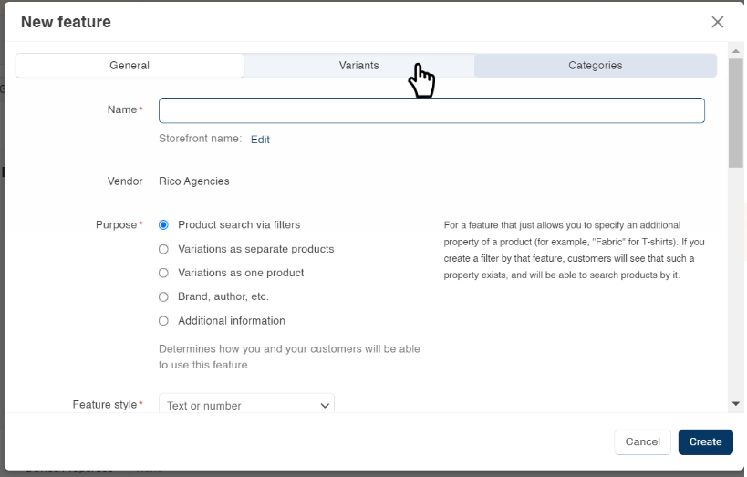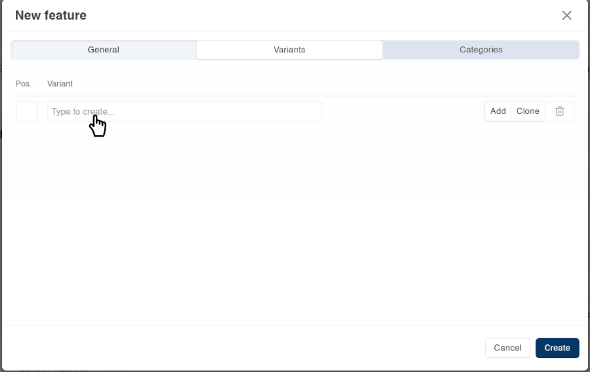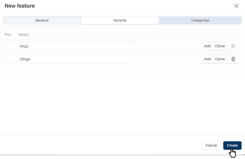 - Type the variants that correspond to the feature (e.g., color options, sizes, or capacities).