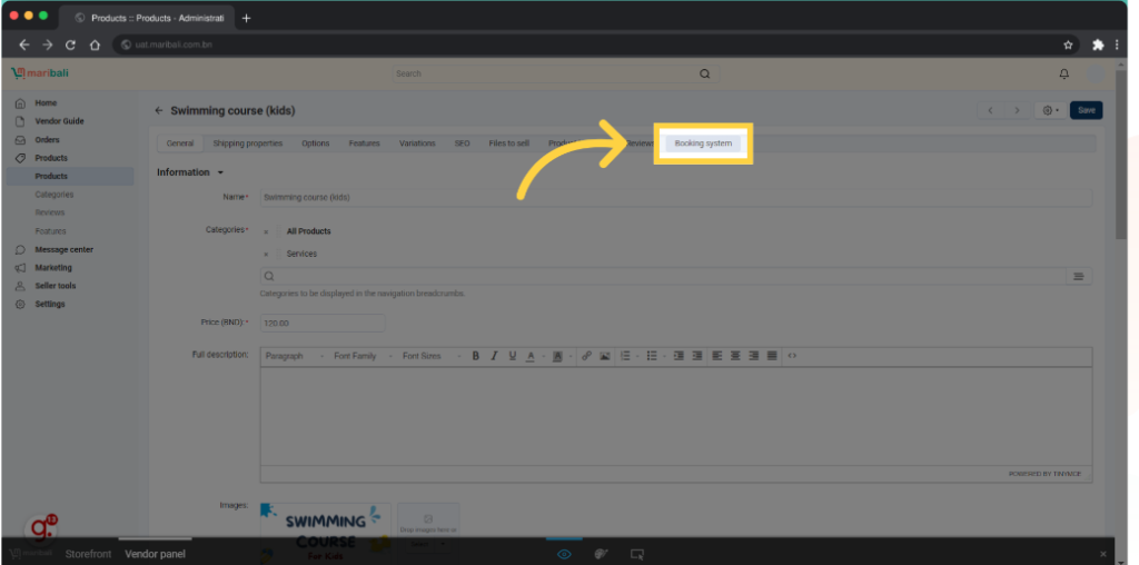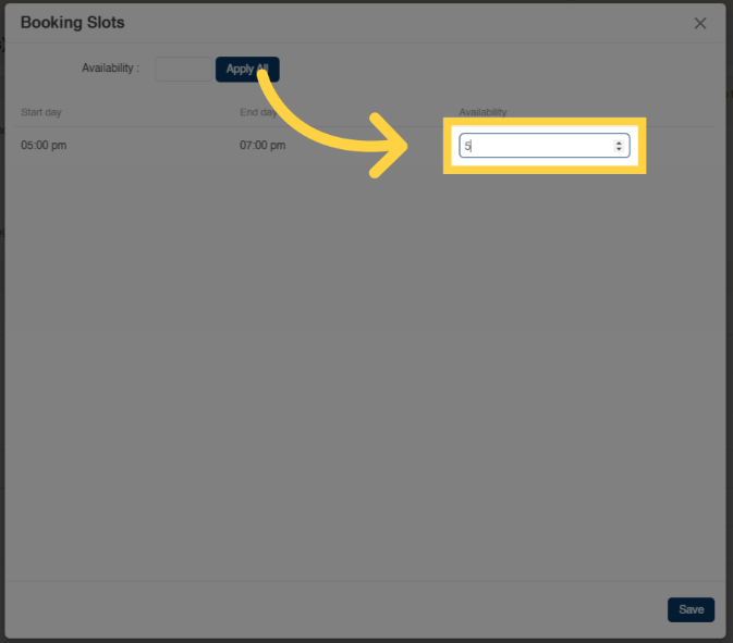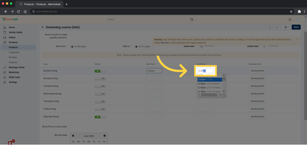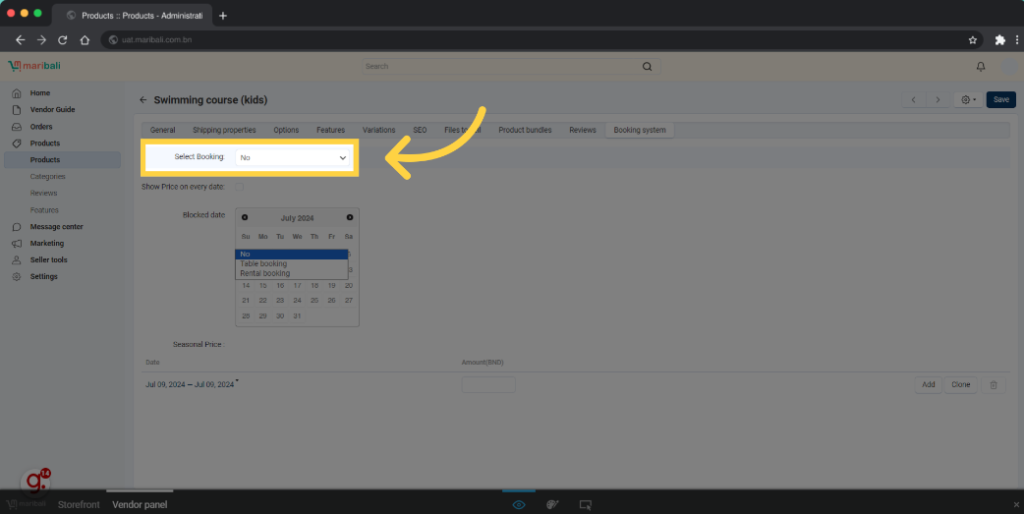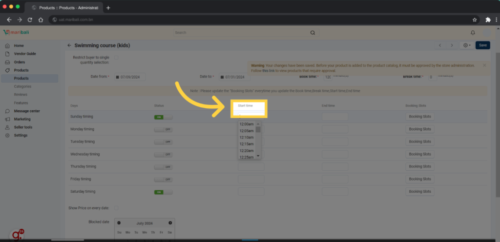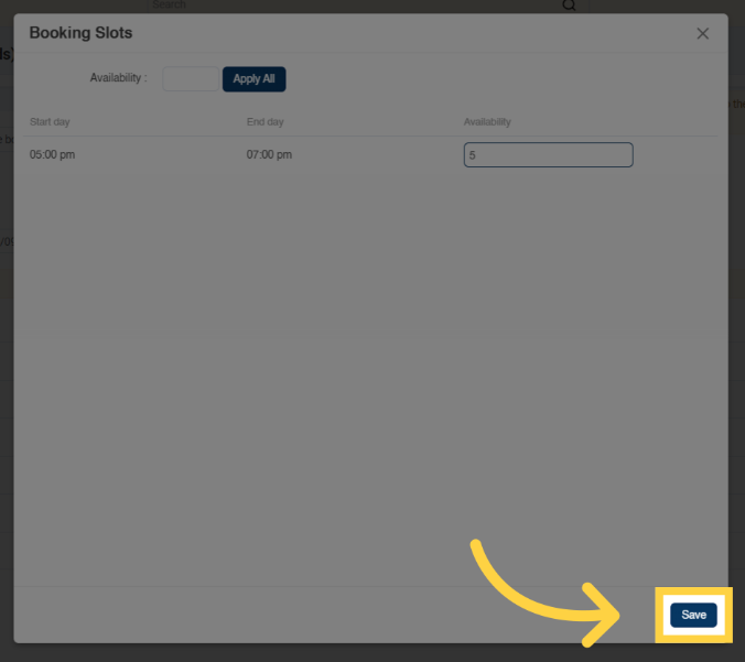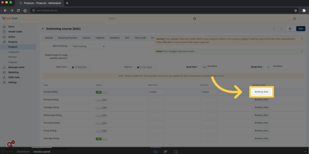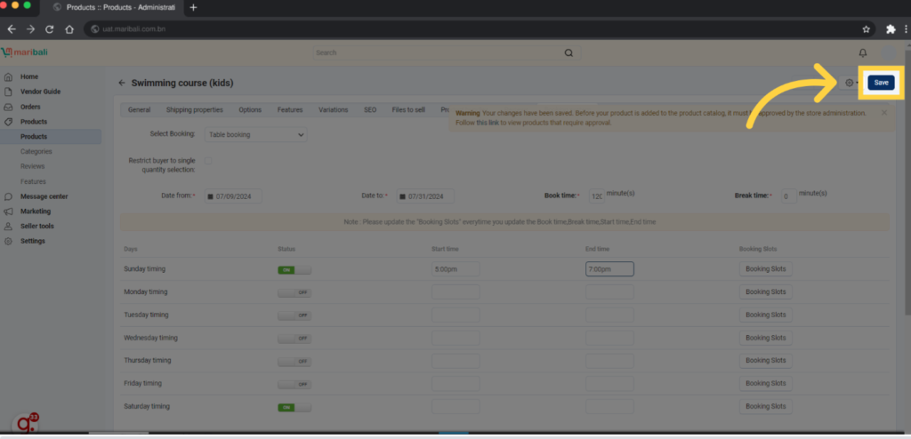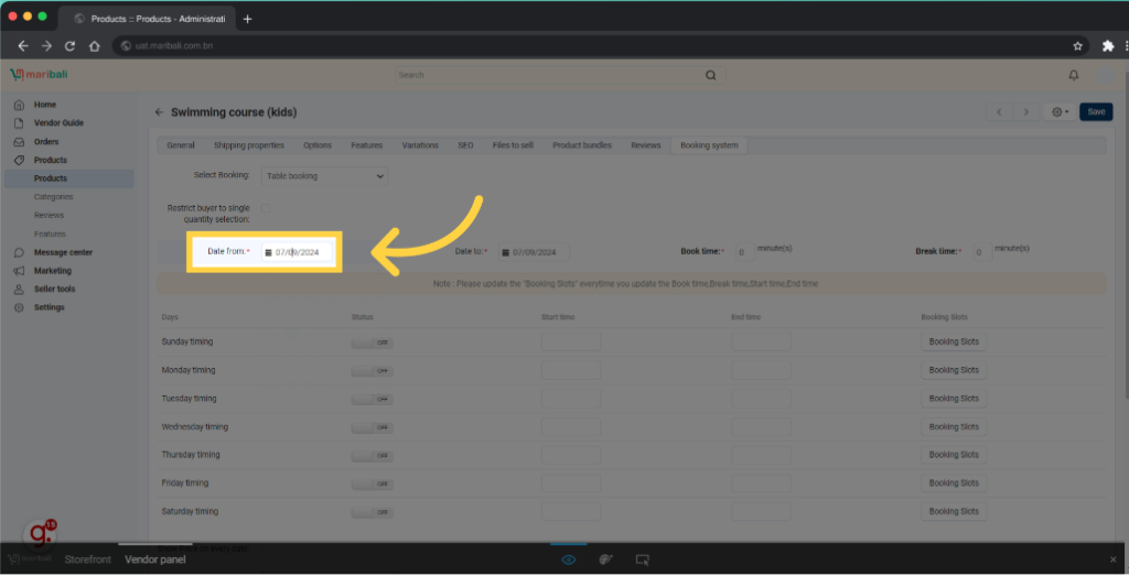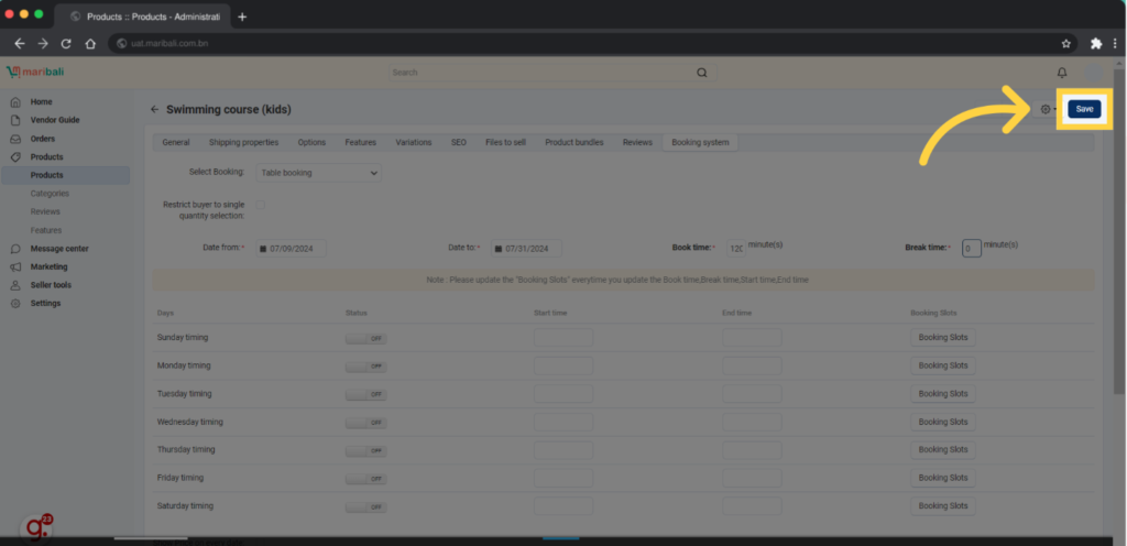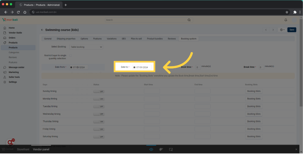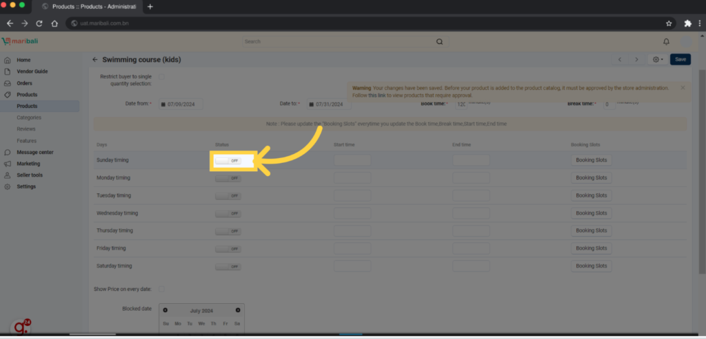 9. To configure booking days, allow certain days to be open for booking by turning the days “On“.