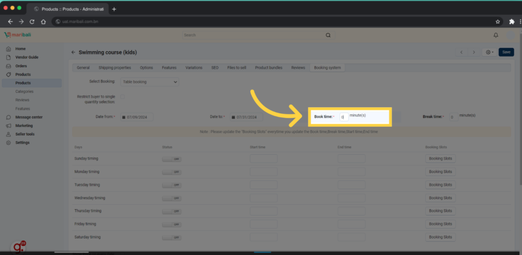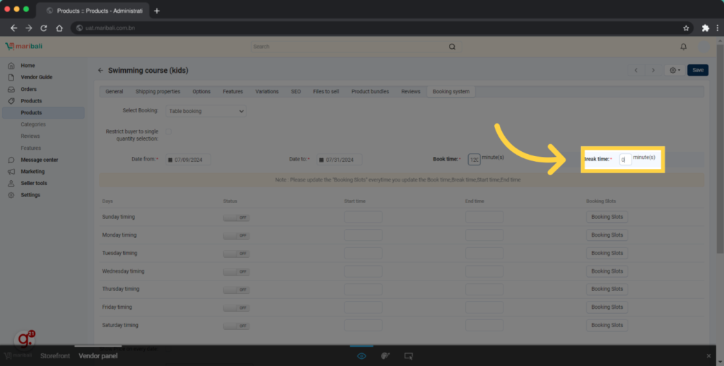 7. Enter the booking duration (in minutes) and any required break time between bookings.